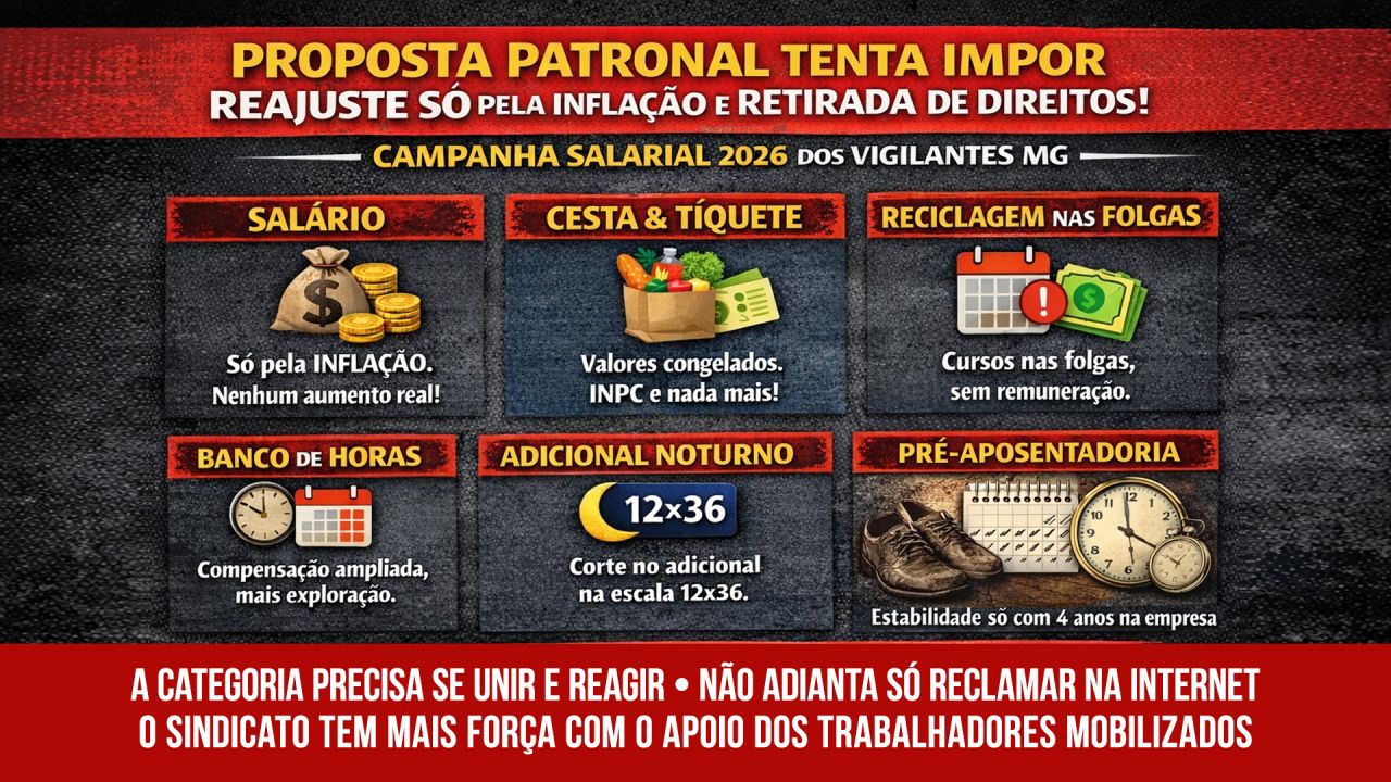 Nas assembleias de janeiro, no interior e em Belo Horizonte, a categoria já deixou claro: essa proposta foi rejeitada porque representa retrocesso. Além disso, o trabalhador quer valorização e exige a sua parte justa do crescimento do setor da segurança privada — que aumentou em cerca de 2 mil novos postos de trabalho apenas em Minas Gerais, entre 2024 e 2025.